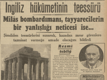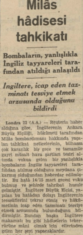 “İngiltere’nin büyük elçisi bugün Hariciye Vekaletine gelerek Milas’ın bombalanması hadisesi şayed İngiliz tayyarecilerin bir yanlışlığı neticesi olmuşsa ki bu ihtimal ilk bakışta imkan dışına addedilemez, İngiltere hükümetinin icab eden tahkikatı derinleştirmek hakkı mahfuz kalmak üzere şimdiden Türk hükümetine derin teessürlerini bildirdiğini ve yanlışın tahakkuku akabinde bu teessüfe şayan kazadan zarar görenlerin zararlarını tazmine amade olacağını tebliği etmiştir.”