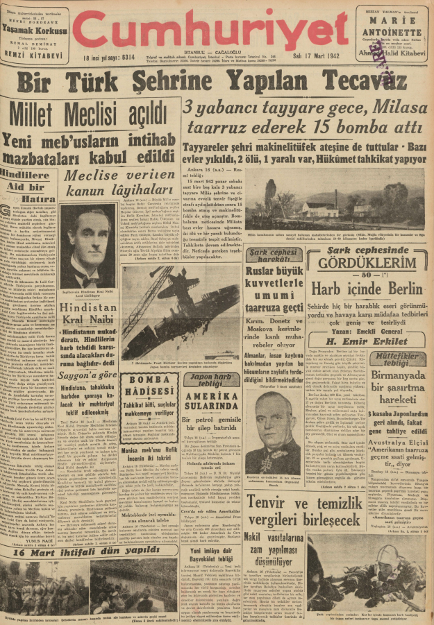19 Mart 1942 tarihli Cumhuriyet gazetesi ise Milas’ın bombalanması ile ilgili şu haberi ilk sayfasında okuyucularına aktarmaktaydı: