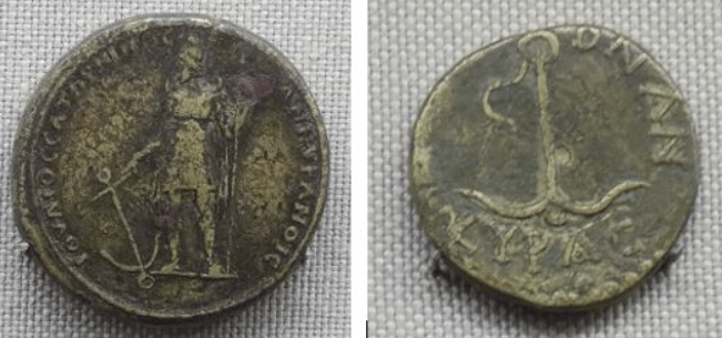 (Soldan sağa) Frig başlıklı Tanrı Men ayakta gemi çıpası tutan Roma sikkesi (Hadrianus (MS 117-138) döneminde basılan Antinoos sikkesi; AMM Çağlar Boyu Ankara Sergisi, 36 nolu sikke) ve  Roma dönemi gemi çıpalı “ANKYPAΣ” sikkesi (Roma imparatoru Gallianus dönemi, MS 253-268; AMM-Çağlar Boyu Ankara Sergisi, 1 nolu sikke)