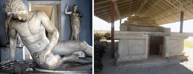 (Soldan sağa) “Ölen Galyalı”- Bergama Kralı I. Attalos, Galatlara karşı kazandığı zaferi kutlamak amacıyla MÖ 230-220 yıllarında saray heykeltıraşı Epigonus’a yaptırmıştır (Şimdi Roma, Capitol Müzesi’ndedir [3]); bir Galat mezarı (Polatlı-Gordion Müzesi)